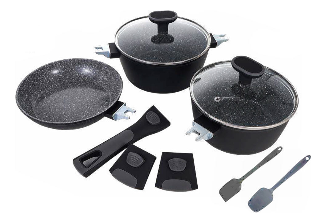- Material de Alta Qualidade: Fabricadas em alumínio resistente, as panelas In Versat Cook Black garantem uma distribuição de calor uniforme, enquanto o fundo triplo proporciona eficiência energética e maior durabilidade.