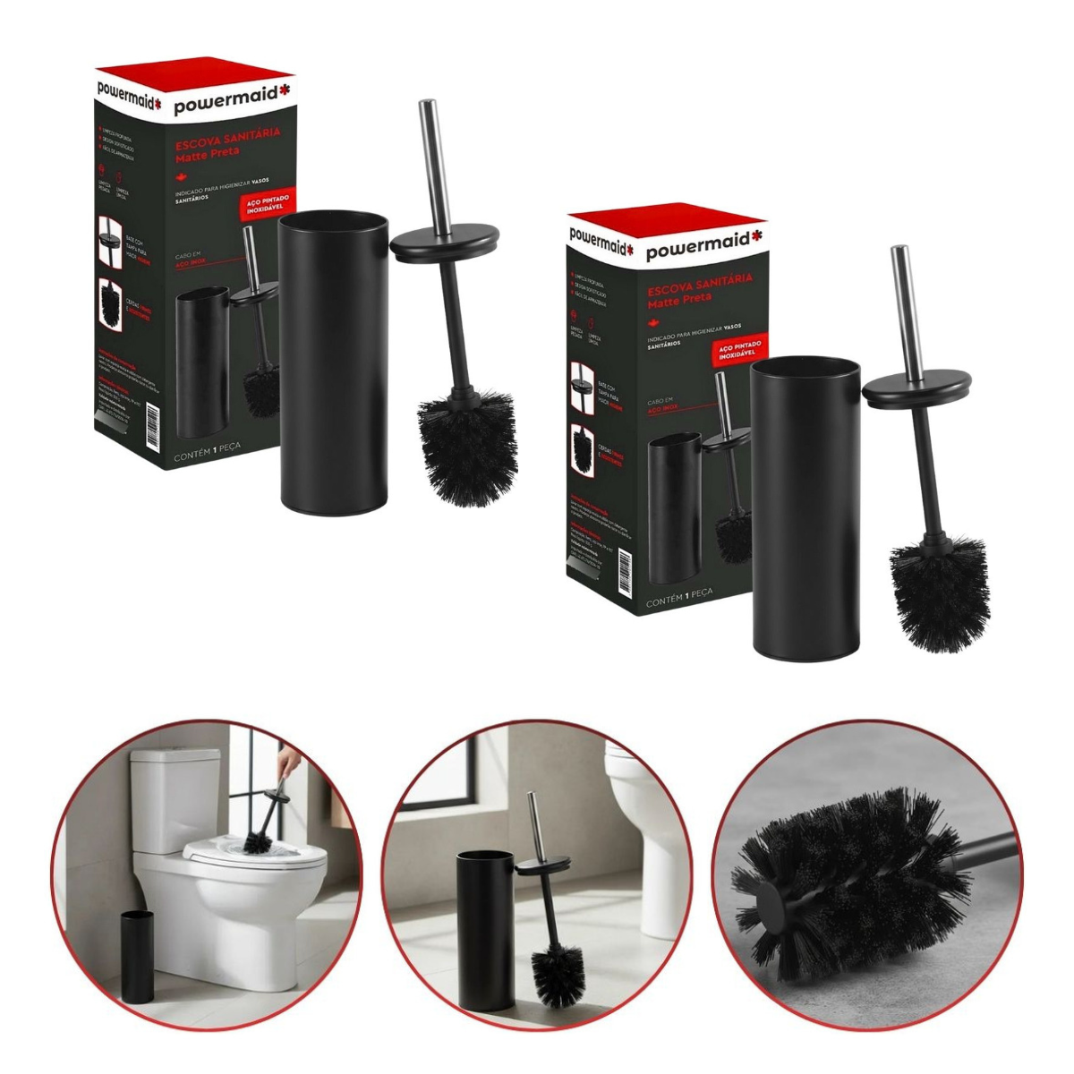 escova sanitária, escova banheiro inox, escova vaso sanitário, escova sanitária preta, escova higiênica banheiro, power maid escova, acessórios banheiro premium