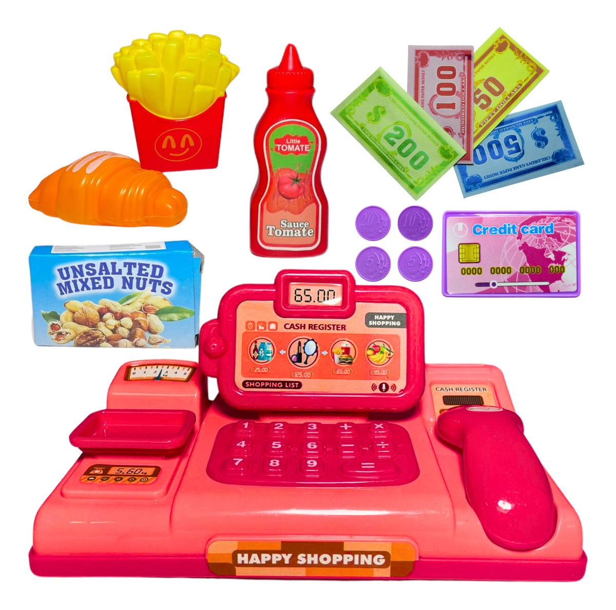 Conteúdo: Mini caixa registradora + comidinhas + dinheirinho